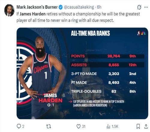 美媒寫道:如果哈登生涯結(jié)束時依舊沒有拿到總冠軍,那么無論從哪方面考慮,他都是有史以來最偉大的無冕之王,在此我要表達崇高的敬意。