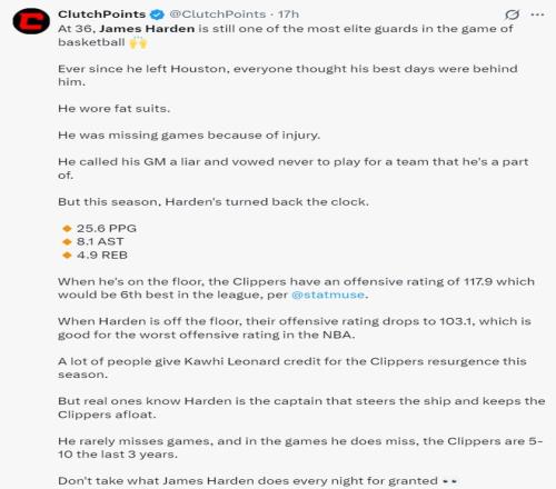 美媒Clutchpoints寫道:36歲的哈登依舊是籃球界最頂尖的后衛(wèi)之一,本賽季的哈登場均25.6分8.1助攻4.9籃板,當他在場時快船進攻效率達到117.9排在聯(lián)盟第六,而當哈登下場時快船進攻效率下滑到103.1聯(lián)盟倒數(shù)之一,哈登在場/不在場進攻效率差值高達14.8。