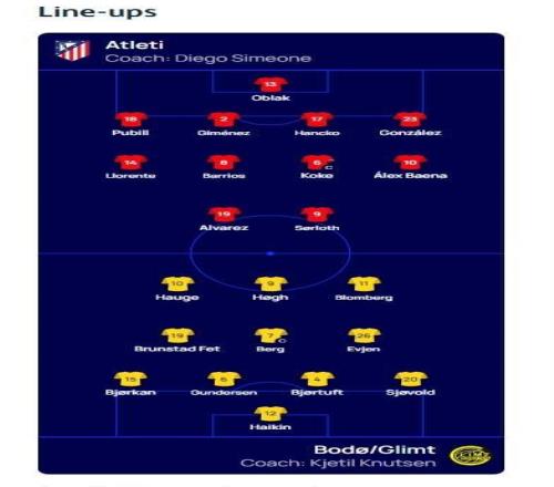 北京時間1月29日04:00,歐冠 聯(lián)賽階段第8輪,馬德里競技主場迎戰(zhàn)博德閃耀,賽前雙方球隊首發(fā)名單公布如下: